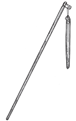 DESCRIZIONE: Manico in legno di larice, arrotondato all’estremità superiore e dotato di un incavo per il fissaggio della striscia di cuoio cui è legata la stringa che unisce al manico il battente in legno di frassino