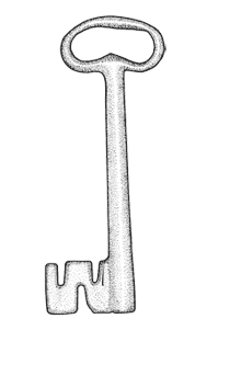 Le antiche chiavi in ferro, di varia foggia, sono composte di un’impugnatura, di un gambo e di una “bandiera” munita di aperture atte far scattare i dispositivi della serratura. Per quanto riguarda il “genere”, le chiavi si dividono in due categorie: quelle munite, nella parte terminale di un perno che s’infilava in un foro centrale della serratura (“chiavi-maschio”) e le “chiavi-femmina” con gambo cavo nella parte terminale nella quale s’infilava il perno centrale di cui erano muniti certi tipi di serratura. L’estro dell’artigiano si esprimeva soprattutto nelle forme e negli abbellimenti dell’impugnatura la quale poteva consistere in un disco metallico di forma circolare o ellittica, provvisto di foro centrale, oppure era formata da un tondino saldato al gambo piegato in varie forme tra le quali le più frequenti erano la circolare e la ellittica. Non mancavano, tuttavia, impugnature dalle forme più complesse.