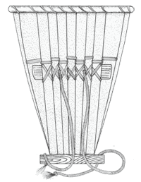 DESCRIZIONE: Seton composto da stecche di larice, base e cerchiatura superiore in larice. Il disegno mostra il sistema di fissaggio degli spallacci legati mediante vimini al corpo della gerla e l’assicella trasversale che permette di scaricare il peso sull’intera struttura