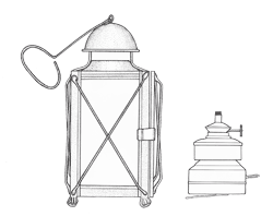 DESCRIZIONE: lanterna di fabbricazione industriale, in latta, a corpo parallelepipedo, con quattro pareti munite di vetro una delle quali apribile; i vetri sono protetti da fili di ferro saldati agli angoli delle pareti; la parte superiore della lanterna, aperta per la fuoriuscita del fumo, è protetta da una calotta semisferica alla sommità della quale è fissato il gancio per il trasporto. All’interno della lanterna, vi è il lume, anch’esso in latta, munito di macchinetta con stoppino (lo faè) piatto e di un capace serbatoio alla base del quale è saldata una linguetta metallica elastica che ne facilita l’estrazione mentre al corpo è saldata un’asola anch’essa utilizzata per l’estrazione