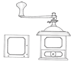 DESCRIZIONE: vecchio macinino di fabbricazione artigianale, in lamierino, maniglia e manopola in legno; sono visibili le riparazioni eseguite con filo di ferro