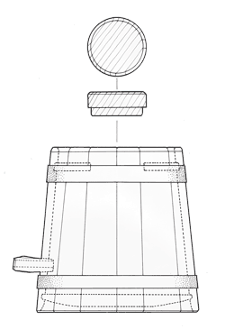 DESCRIZIONE: nella parte superiore de lo boè, solidale al corpo del recipiente, vi è un diaframma munito di foro in cui viene introdotto un tappo di legno che ne assicura la chiusura. A un quarto circa dell’altezza, in prossimità del fondo, lo boè presenta una spina di legno (la brotsetta) inserita nella parete e ricavata da un solo pezzo di legno munito all’interno di foro. Il fondo de lo boè, come accade in tutti i recipienti dogati, è inserito in una scanalatura praticata nelle doghe che corre tutt’intorno all’interno del recipiente