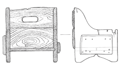 DESCRIZIONE: la seggiola, in legno di larice, è composta da uno schienale costruito con due tavolette sovrapposte; di un sedile costruito anch’esso con due tavolette e di due fiancate sagomate rinforzate, all’esterno, con due assicelle inchiodate. Lo schienale è munito di apertura per il trasporto